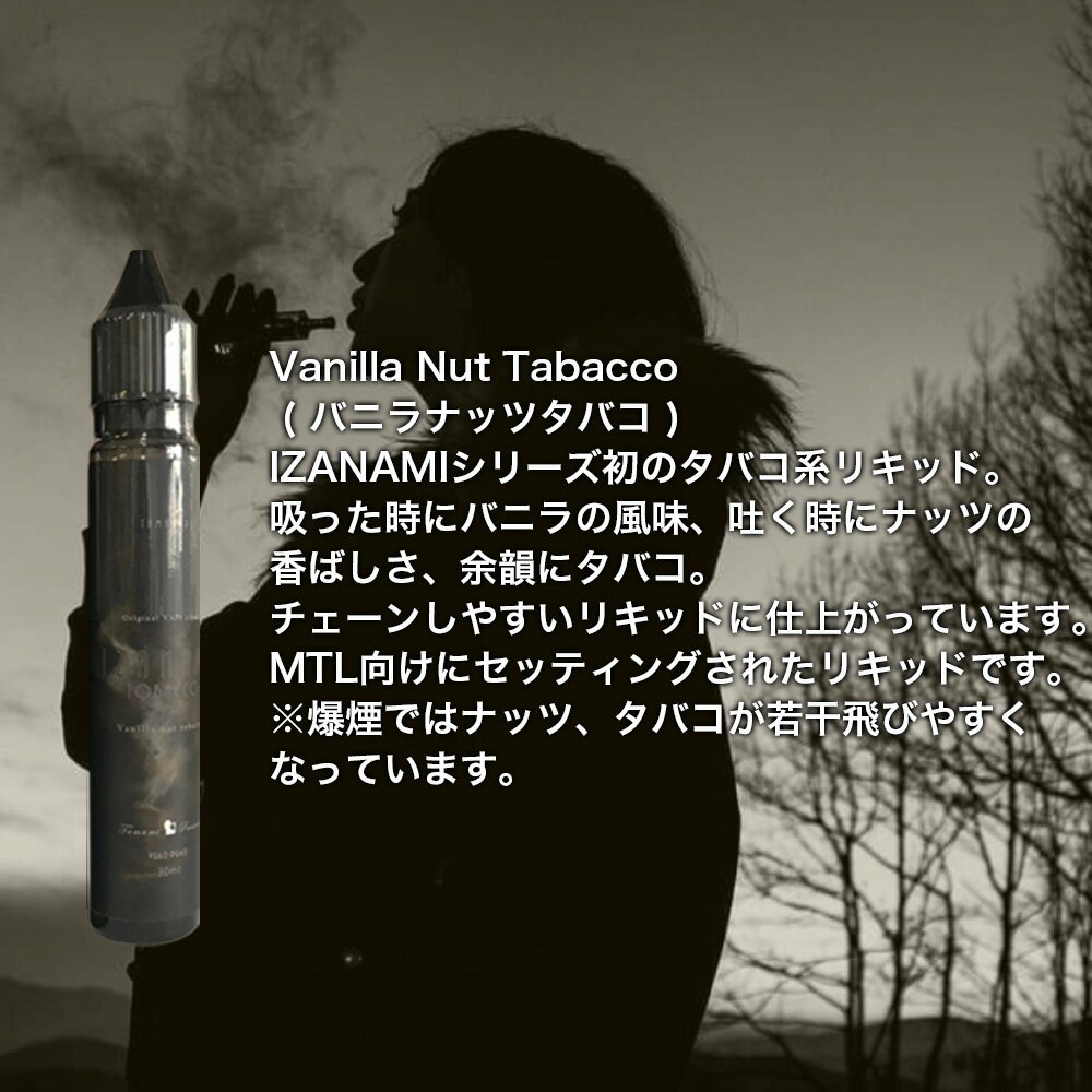 また商品名や内容量、原材料などもしっかり記載されており、ハンドメイドらしい手書きの製造日のデザインもセンスが光り素敵です!! 今回はその中でも人気のある商品を取り揃えました!! 話題のTAMA VAPE IZANAMI ( タマベイプ イザナミ )シリーズを是非ご自身の手でお楽しみください!! 【バリエーション紹介】 〇 Vanilla Nut Tabacco ( バニラナッツタバコ ) IZANAMIシリーズ初のタバコ系リキッド。