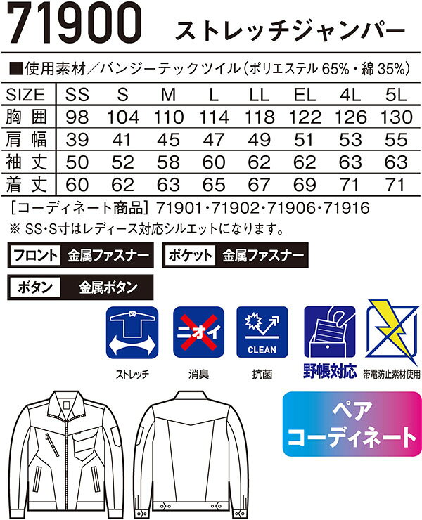 スペック メーカー 自重堂(JICHODO) 品番/シリーズ 71900 71916/Z-DRAGON 71900シリーズ シーズン 秋冬物 ※このシリーズの春夏対応シリーズはコチラ 商品名 ストレッチジャンパー&ストレッチレディースカーゴパンツセット(上下同色) 素材 バンジーテックツイル(ポリエステル65%・綿35%) 機能 ストレッチ、消臭、抗菌、野帳対応(ジャンパー)、製品制電素材使用 仕様 ジャンパー:SS・S 寸はレディース対応シルエットになります。