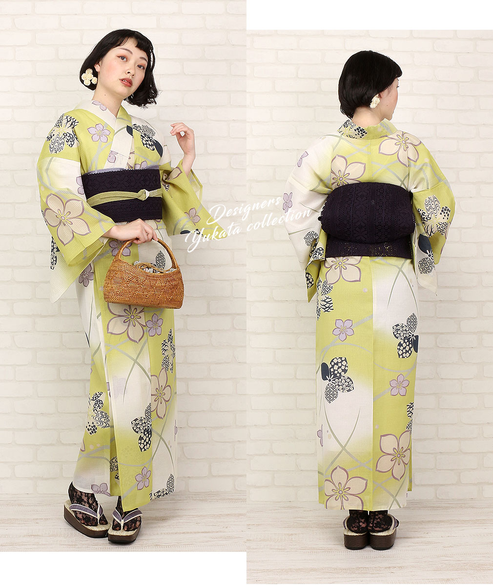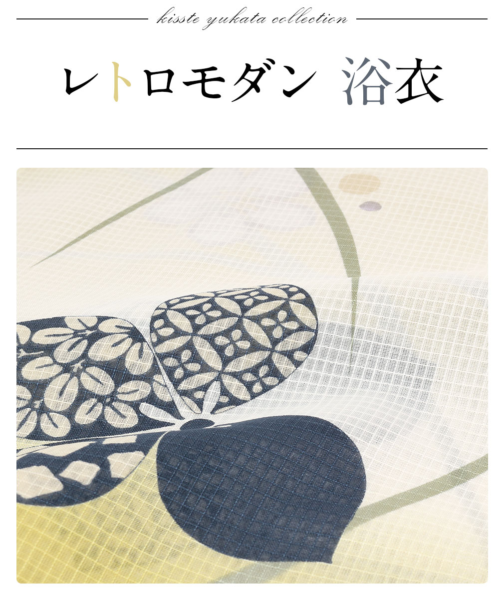 黄緑かかった黄の地色にはグラデーションが施され、浴衣いっぱいに描かれたレトロ花々に美しく映えます。
