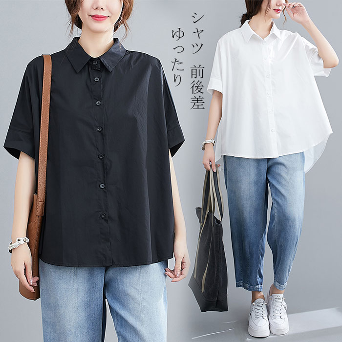 【夏SALE 2680円→2480円】シャツ レディース 白シャツ ブラウス チュニック ロング丈 トップス 半袖 大きいサイズ 無地 Tシャツ 涼しい オシャレ 前後差 フォーマル 白 黒 通勤 フォーマル 送料無料