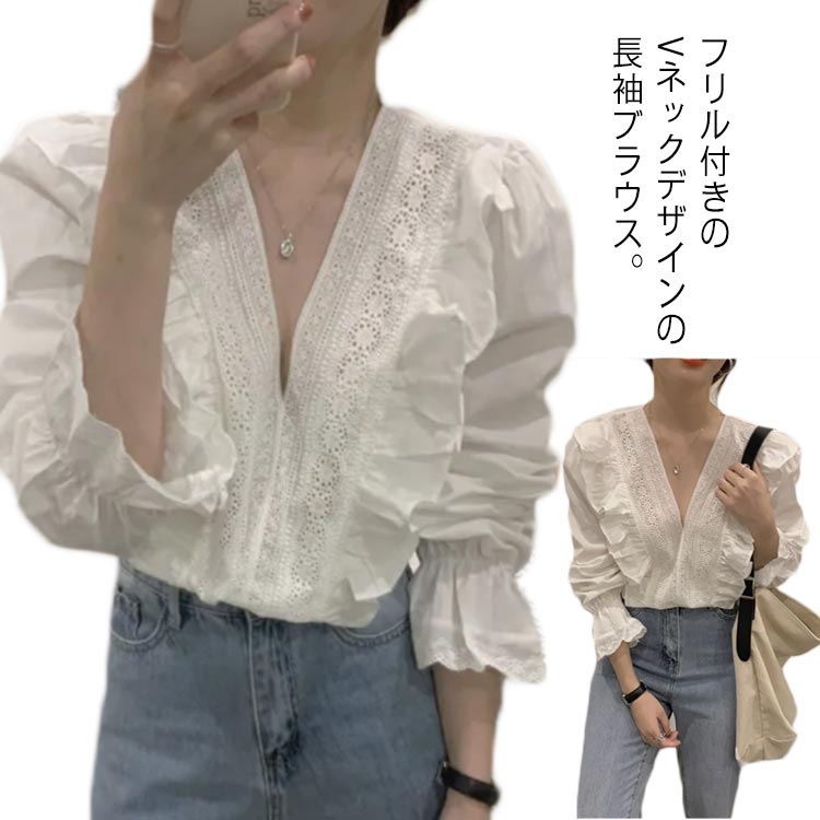 ブラウス Vネック トップス 長袖 フリル レディース ゆったり レース シャツ きれいめ 春 秋 カジュアル おしゃれ 可愛い フェミニン ガーリー エレガント シンプル 綿 ホワイト 白 送料無料