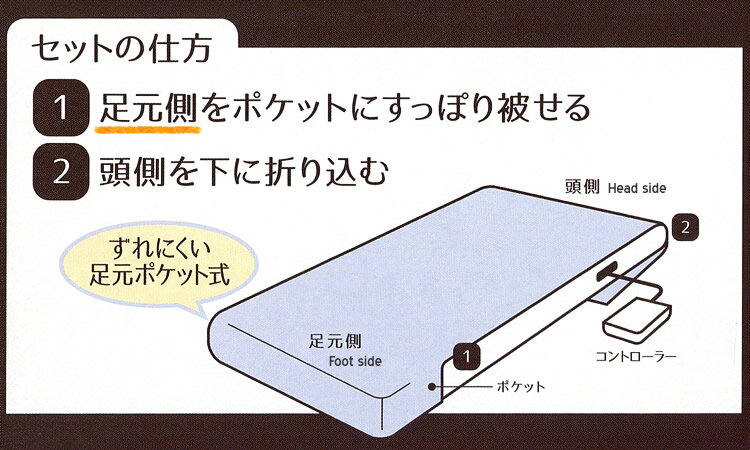着脱簡単・ぴったりフィット!●使い方 ・・・ シーツ折り返し部分を敷き布団の頭側に掛けて敷き伸ばし、足元の布地は布団の下に折り込みます。
