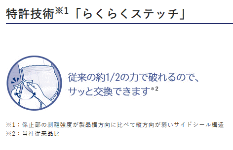 ○改良技術:背モレブロック構造 紙パンツ単体使用時の多量な尿・便をせき止める。