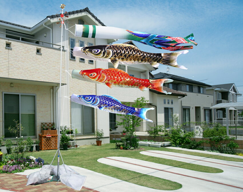 薫風鯉のぼり 狭いスペースで、地面がコンクリートでも芝生でも庭に穴を掘る(工事)煩わしさ無く約40分で簡単に鯉幟を楽しめます。