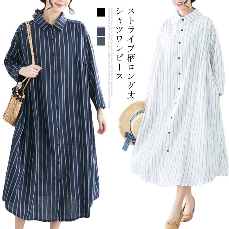 送料無料シャツワンピース リネンワンピース レディース 大きいサイズ シャツワンピース 麻生地 リネン混 九分袖 ロングワンピース ミモレワンピース 折り襟 薄手 ストライプ柄 ゆったり お洒落 カジュアル スッキリ 爽やか 夏新作