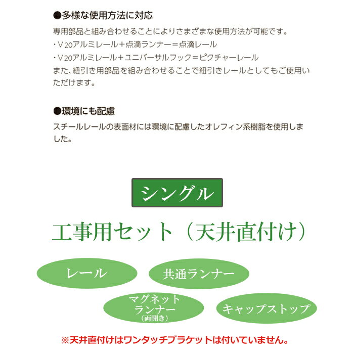 【スチール】 V20 工事用セット サイズ表 (正面付) シングル 182cm (天井直付) シングル 182cm (正面付) シングル 200cm (天井直付) シングル 200cm (正面付) シングル 273cm (天井直付) シングル 273cm (正面付) シングル 364cm (天井直付) シングル 364cm (正面付) ダブル 182cm (天井付) ダブル 182cm (正面付) ダブル 200cm (天井付) ダブル 200cm (正面付) ダブル 273cm (天井付) ダブル 273cm (正面付) ダブル 364cm (天井付) ダブル 364cm ●材質違いでアルミもございます↓ 【アルミ】 V20 工事用セット サイズ表 (正面付) シングル 182cm (天井直付) シングル 182cm (正面付) シングル 200cm (天井直付) シングル 200cm (正面付) シングル 273cm (天井直付) シングル 273cm (正面付) シングル 364cm (天井直付) シングル 364cm (正面付) ダブル 182cm (天井付) ダブル 182cm (正面付) ダブル 200cm (天井付) ダブル 200cm (正面付) ダブル 273cm (天井付) ダブル 273cm (正面付) ダブル 364cm (天井付) ダブル 364cm